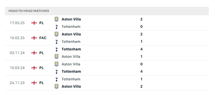 Phong độ gần đây Tottenham vs Aston Villa