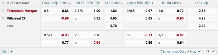 Bảng tỷ lệ kèo bóng đá hôm nay Tottenham vs Villarreal