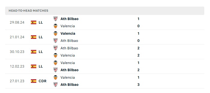 Lịch sử đối đầu Valencia vs Athletic Bilbao