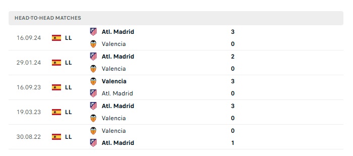 - Kèo tỷ số H2 Valencia vs Atletico Madrid: 0-2