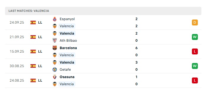 Phong độ gần đây Valencia vs Real Oviedo