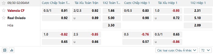 Bảng kèo bóng đá Valencia vs Real Oviedo