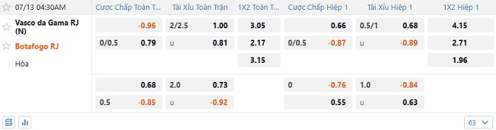 - Kèo tỷ số H1 Vasco vs Botafogo/RJ: 0-0