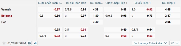 Bảng tỷ lệ kèo bóng đá Venezia vs Bologna