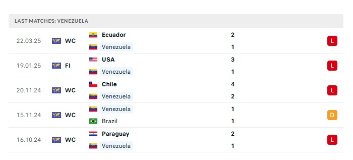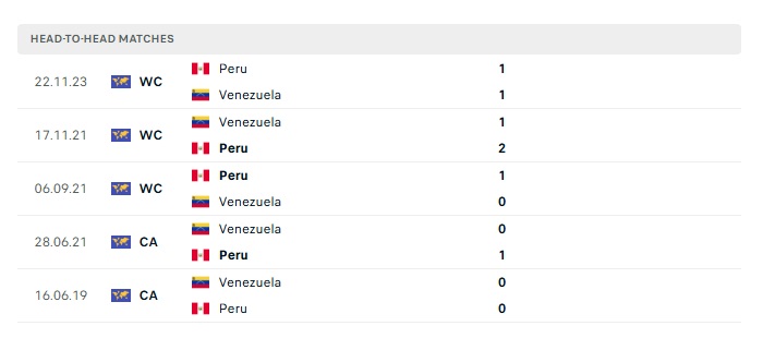 Theo ghi nhận, trong các cuộc đối đầu gần đây của hai đội, Venezuela luôn bị lép vế trước đối thủ. Bằng chứng là trong 7 lần gặp nhau gần nhất của cả hai, họ đã hòa nhau 4 và Peru thắng 3 trận còn lại. Thậm chí, 4 trận sân nhà liên tiếp vừa qua của Venezuela cũng đã khép lại với kết quả toàn hòa. Do đó, Hòa sẽ trở thành lựa chọn an toàn nhất ở kèo châu Âu trận đấu hôm nay.