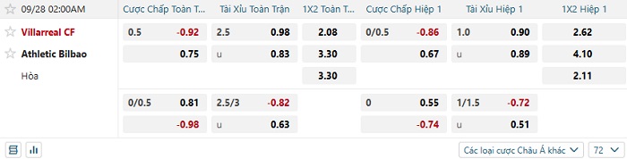 Bảng tỷ lệ kèo bóng đá Villarreal vs Athletic Bilbao