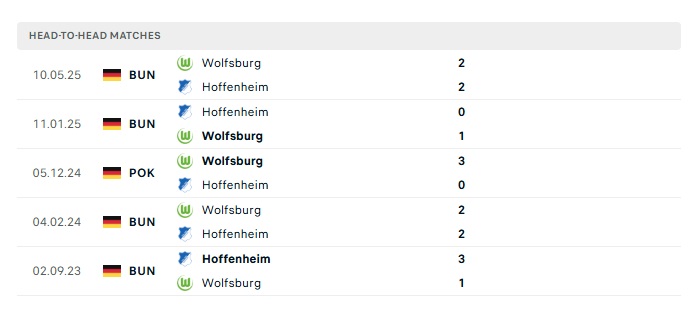 Lịch sử đối đầu Wolfsburg vs Hoffenheim