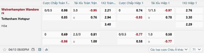 Soi kèo châu Á, kèo Wolves vs Tottenham